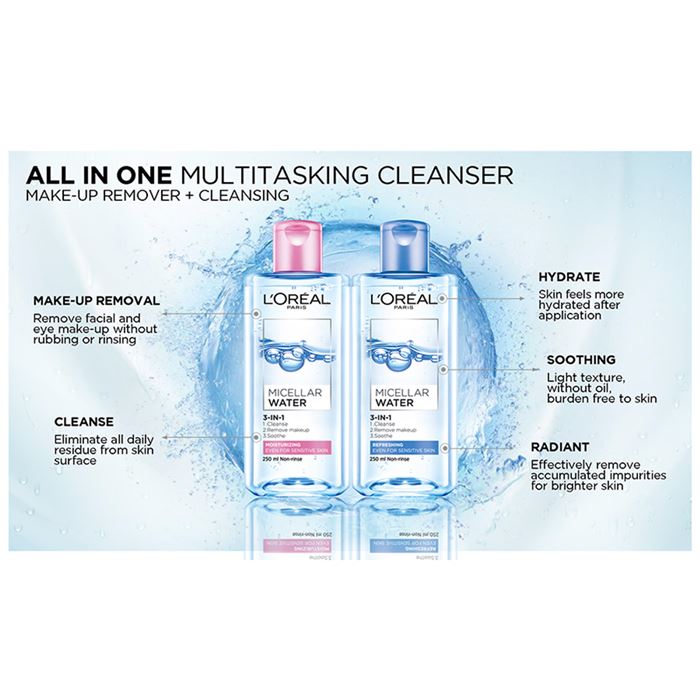 میسلار واتر دو فاز دارای دو لایه است که امکان پاک کردن انواع آرایش حتی آرایش ضد آب را فراهم می‌کند. (1) لایه میسلی: این لایه از ذرات ریز میسلی تشکیل شده است که در آب نرم معلق هستند. این ذرات ریز در کنار هم قرار می‌گیرند تا آلودگی، روغن، آرایش و سایر ناخالصی‌ها را بدون خشک کردن پوست شما جذب کنند. مانند یک آهنربا، ناخالصی‌ها از روی پوست شما پاک می‌شوند و بدون نیاز به شستشوی اضافی، پوست را کاملا تمیز می‌کنند. اثربخشی این مولکول‌های میسلی پیشرفت، پاکسازی ملایمی را تضمین می‌کند که نیازی به مالش شدید حتی برای آرایش‌های سنگین ندارد! (2) لایه پاک کننده: این فرمول منحصر به فرد به طور خاص آرایش ضد آب را پاک می‌کند و در عین حال پوست را آبرسانی و مرطوب می‌کند. بهترین بخش این است که در فرمول هیچ ماده "مثل" وجود ندارد - بدون روغن، عطر یا الکل - که حتی حساس‌ترین انواع پوست را تحریک کند.
