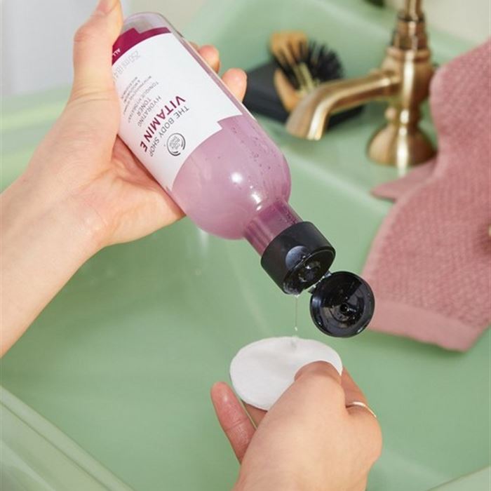 پس از پاک کردن آرایش و شستشوی صورت، پد یا پنبه آرایشی را آغشته به تونر ویتامین ای بادی شاپ کرده و به آرامی با حرکت دورانی پوست خود را تمیز نمایید. توجه داشته باشید که به اطراف چشم نزنید.