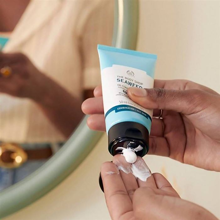 پس از شستشوی صورت و استفاده از تونر، مقداری از مرطوب کننده و کنترل چربی جلبک دریایی بادی شاپ را روی انگشتان دست ریخته و به آرامی روی صورت و گردن ماساژ دهید.