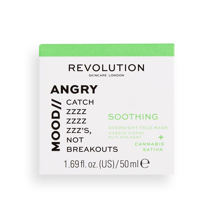 ماسک آبرسان رولوشن Soothing Overnight با نام Revolution Skincare Angry Mood Soothing Overnight Face Mask : در صورتی که پوستتان مشکلی دارد، این نباید باعث شود که حال شما هم بد شود. هر نوع پوستی که داشته باشید، چه پوستی که تحت فشار است، چه پوست حساس، تشنه و دهیدراته، در هر صورت ماسک رولوشن میتواند آن را تسکین داده و به خوبی آبرسانی نماید. این محصول حس تنش و کشیدگی پوست را کاهش داده و حس راحتی روی آن ایجاد میکند. ماسک آبرسان رولوشن با ملایمت پوست را آبرسانی کرده و آن را نرم و تغذیه میکند. این محصول حاوی روغن کنف است. این ماده خاصیت تسکین دهندگی و تغذیه کنندگی دارد. ماسک رولوشن خیلی سریع به عمق پوست نفوذ کرده و در همان لحظه آرامش را به شما و پوست صورتتان هدیه میکند.